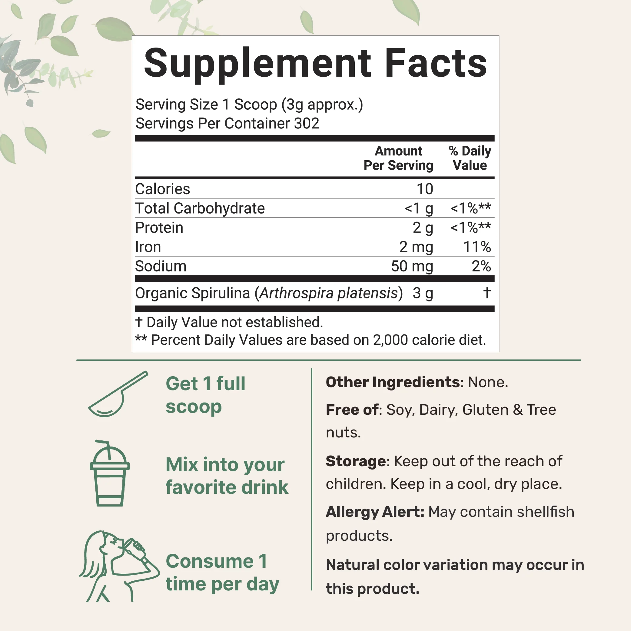 A premium USDA organic, non-irradiated spirulina powder rich in plant-based protein, essential nutrients, and antioxidants for daily wellness support.